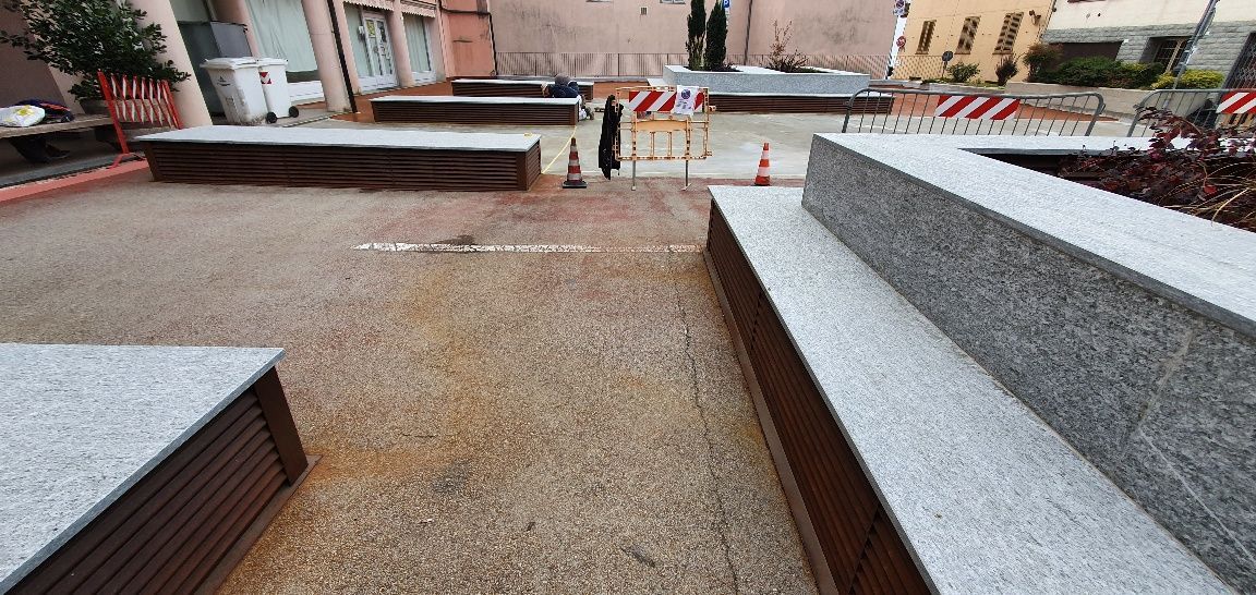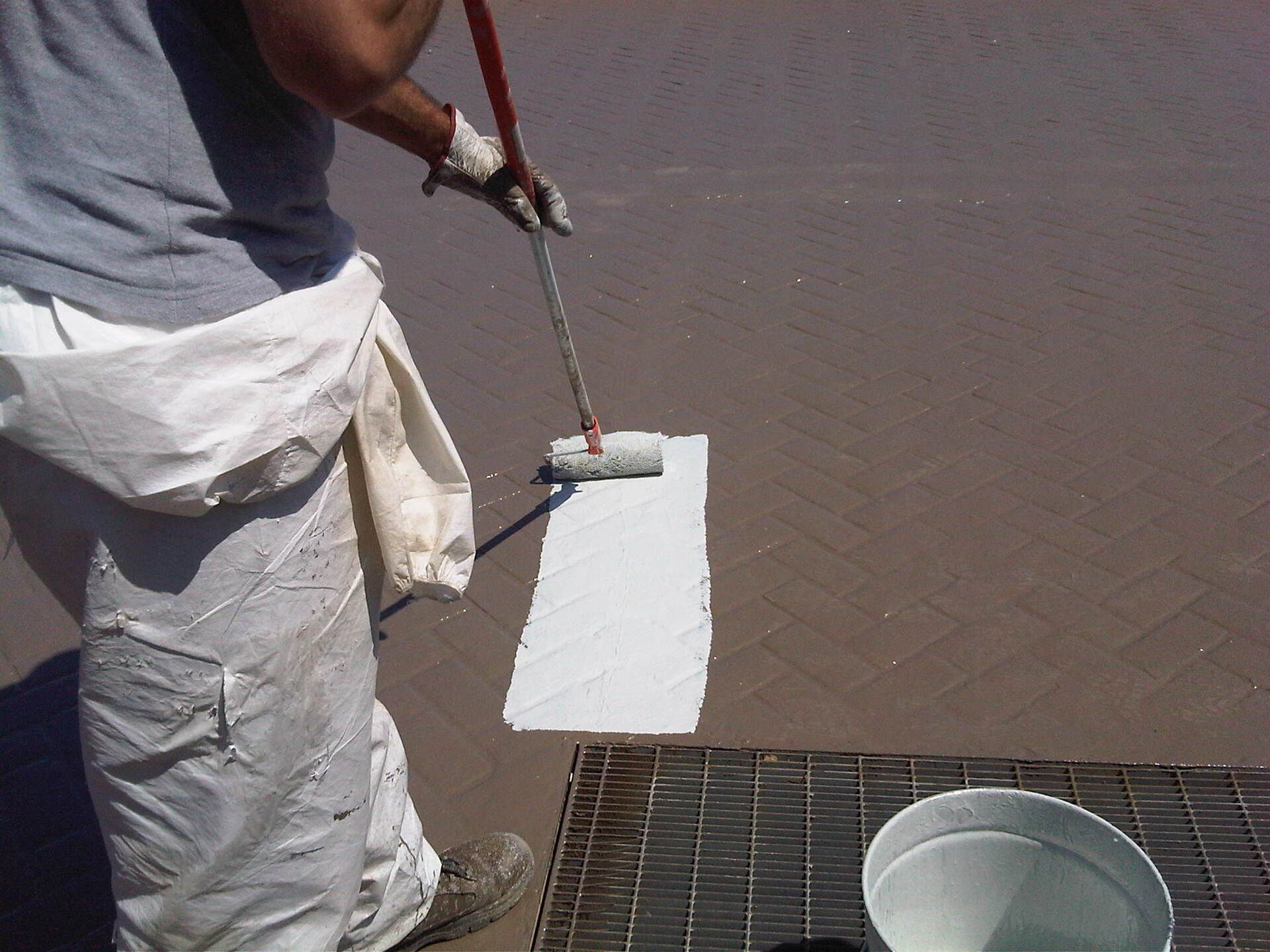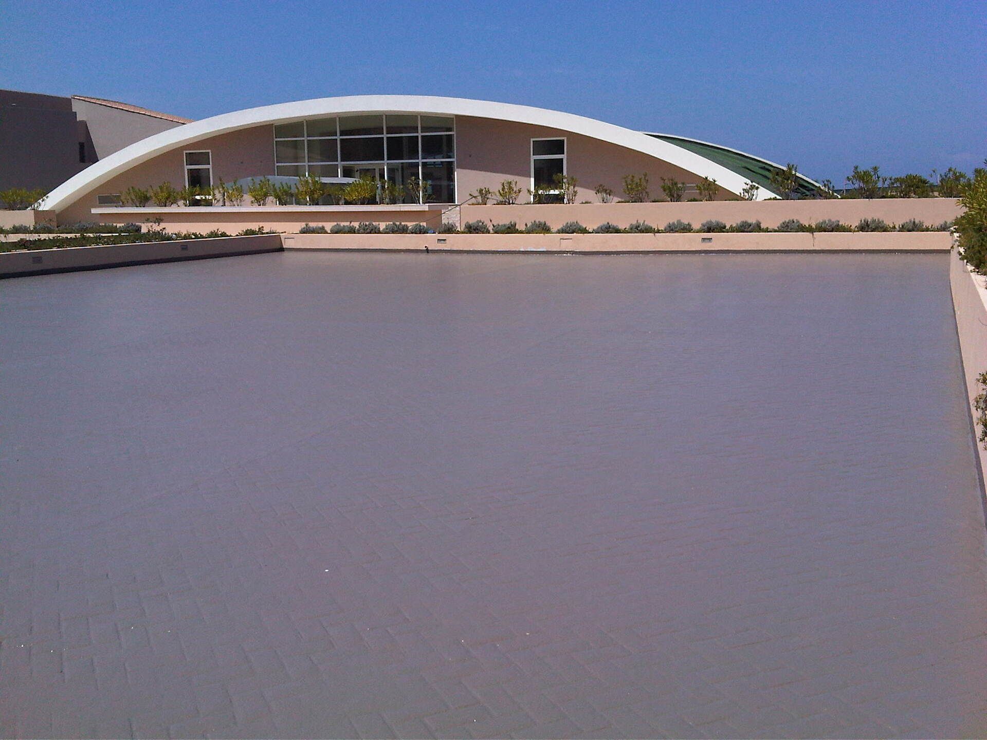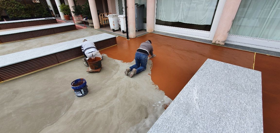 Impermeabilizzazione decorativa e carrabile di piazzetta comunale sovrastante parcheggi sotterranei, mediante ciclo cementizio elastomerico, pigmentato nella mano finale